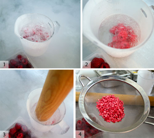 將樹莓分開。1)在液氮中放入一些覆盆子(確保足夠)。2)等待劇烈的沸騰停止-現(xiàn)在漿果一直被冷凍。您可以根據(jù)需要減少凍結(jié),但是硬凍結(jié)使您的工作時間更長。3)用a面杖搗碎漿果。4)應變。